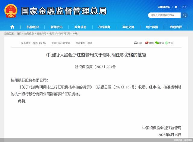 北京商报讯(记者 宋亦桐)6月16日,银保监会浙江监管局发布《关于虞利明任职资格的批复》,核准虞利明的