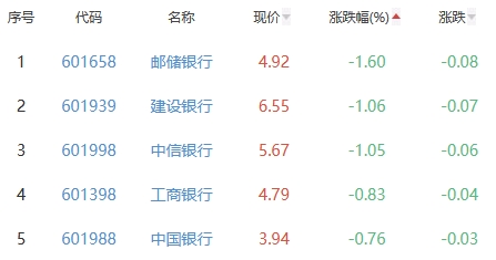邮储银行、建设银行、中信银行、工商银行、中国银行位列涨幅榜后五位,涨幅分别为-1.60%、-1.06%、-1.05%、-0.83%、-0.76%。