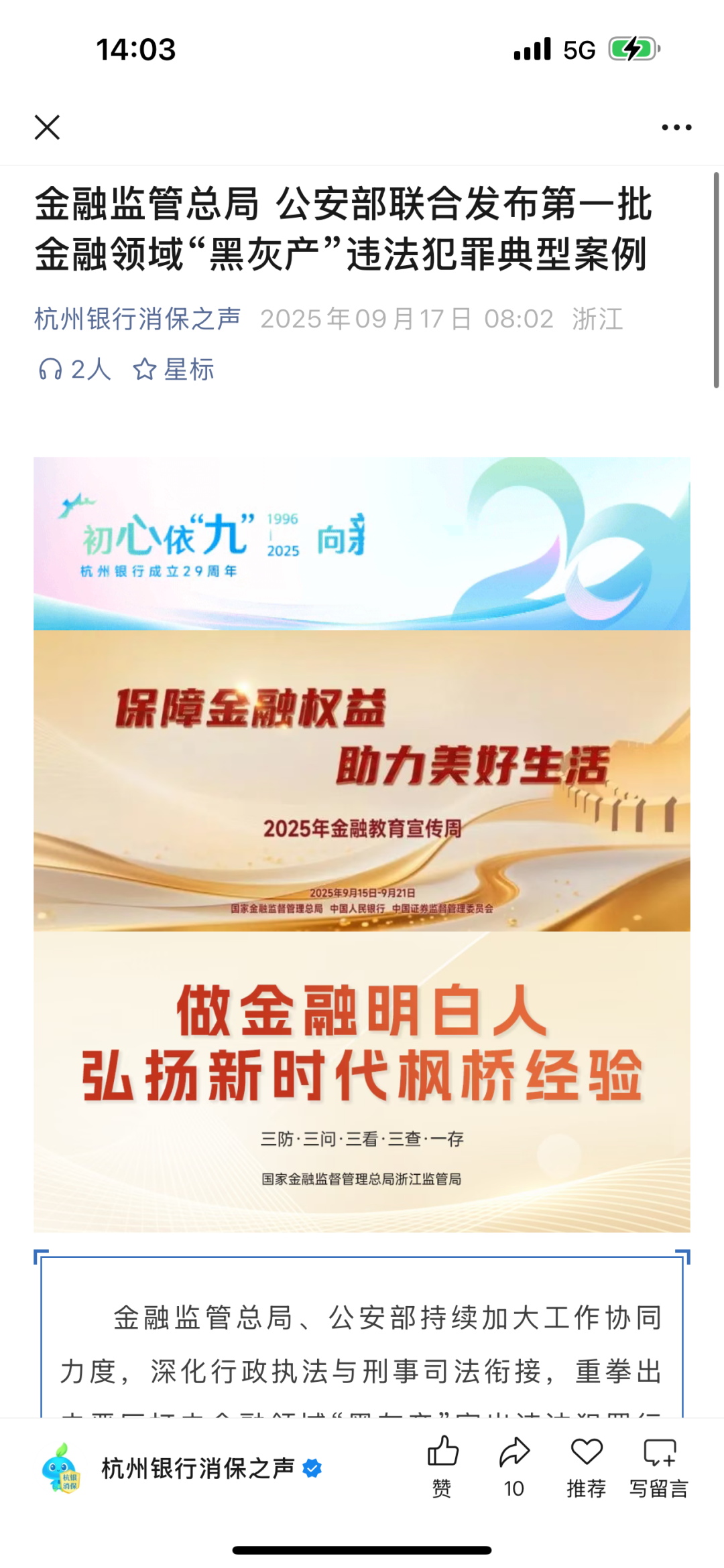 推出“我在古代当反诈官”系列短视频、“杭杭历险记”反诈系列,向社会公众揭示和解析各类非法金融活动,帮助消费者有效识别和防范风险,营造安全放心的消费和投资环境;“风险提示送上门”行动,推出《当心“非法代理维权”陷阱》《警惕“共享屏幕”陷阱,守护资金安全莫大意》等多个风险提示,将金融知识和防非反诈送至家家户户。