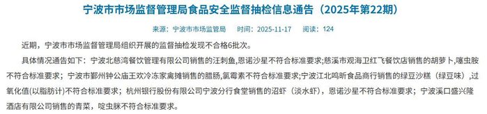 日前,宁波市市场监督管理局发布2025年第22期食品安全监督抽检结果通告,6批次抽检样品检出不合格,其中杭州银行宁波分行食堂销售的沼虾(淡水虾),存在恩诺沙星残留超标的情况。