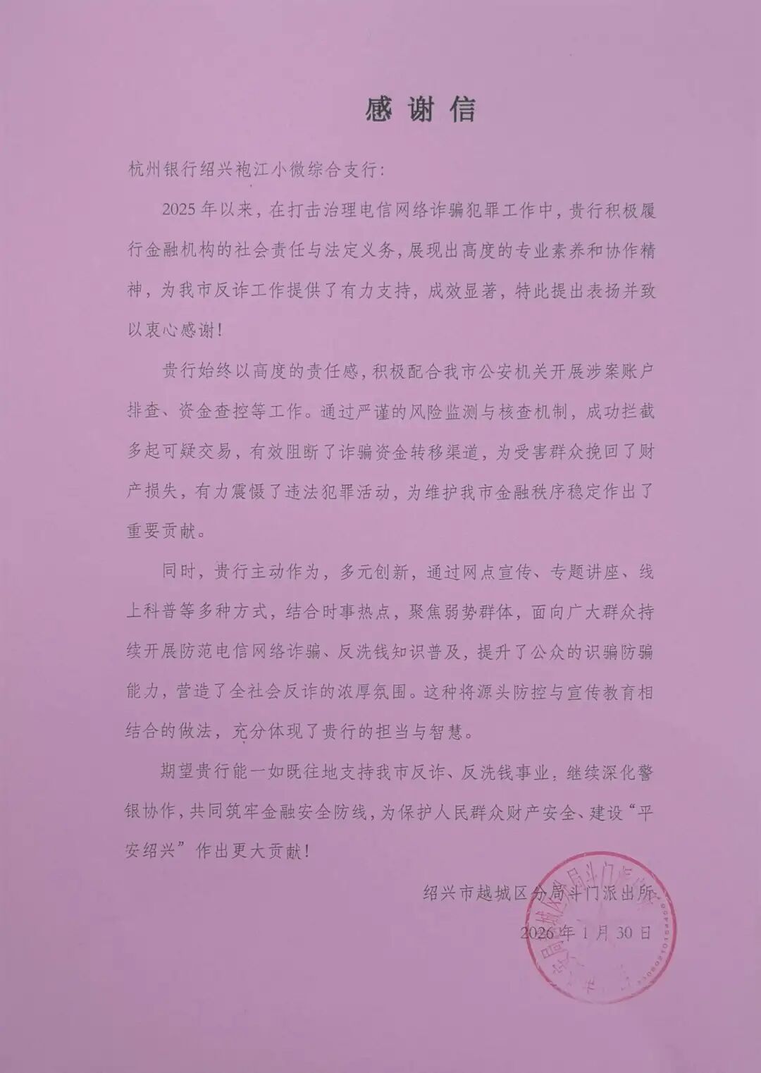 在防诈反诈方面,杭州银行绍兴袍江小微综合支行收到绍兴市公安局越城区分局斗门派出所的感谢信。信中高度评价支行在反诈、反洗钱工作中的高效协作与专业表现,对其积极贡献致以诚挚感谢。