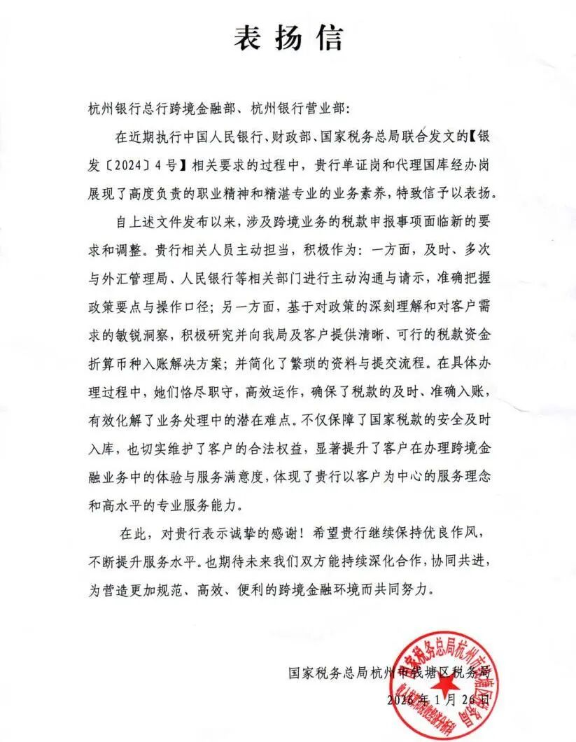 近日,杭州银行收到国家税务总局钱塘税务分局发来的表扬信,信中对我行跨境金融部与营业部提出高度赞扬。