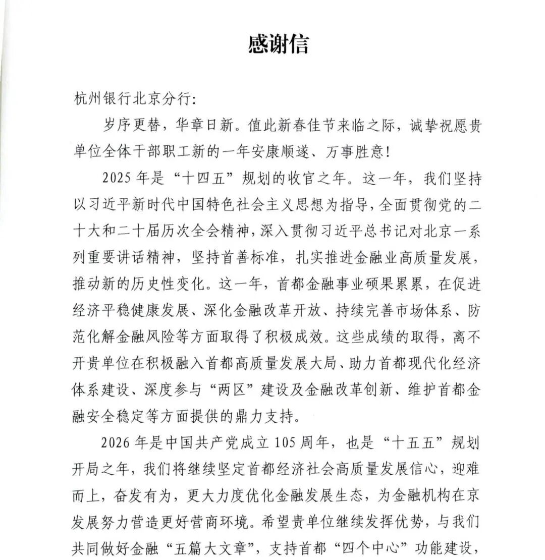 杭州银行北京分行也收到北京市委金融委员会办公室发来的感谢信,对分行在积极融入首都高质量发展大局、助力首都现代化经济体系建设、深度参与“两区”建设及金融改革创新、维护首都金融安全稳定等方面所作出的贡献给予了充分肯定。
