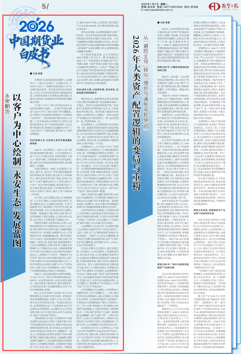 1月5日,“期货日报”2026年第一刊报道《永安期货:改革破浪 数智领航 以客户为中心绘制“永安生态”发展蓝图》。聚焦在期货行业深刻变革的浪潮中,永安期货以“一流衍生品投行”为战略目标,于2025年交出了一份兼具突破性意义与行业引领价值的答卷。2026年,永安期货将在“产业链风险管家、衍生品资产配置行家、跨境综合金融服务专家”三大定位指引下,扬帆远航,驶向更为广阔的发展蓝海。