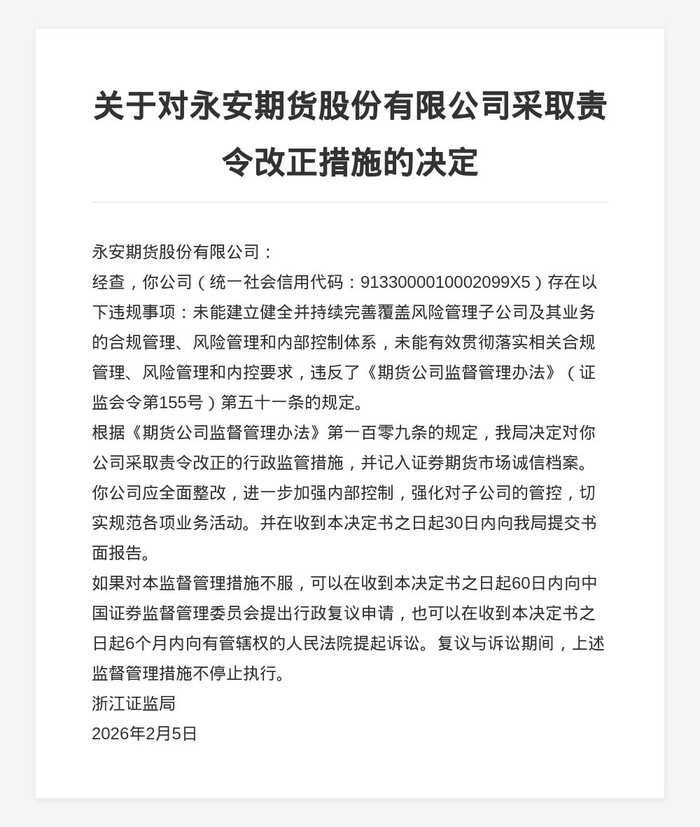 蓝鲸新闻2月16日讯,近日,浙江证监局发布行政监管措施决定书,剑指永安期货股份有限公司。