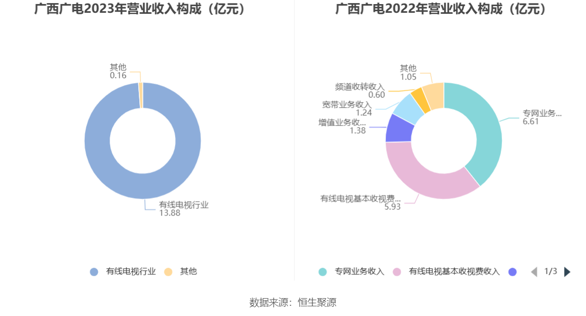 分产品来看,2023年公司主营业务中,有线电视行业收入13.88亿元,占营业收入的98.85%。