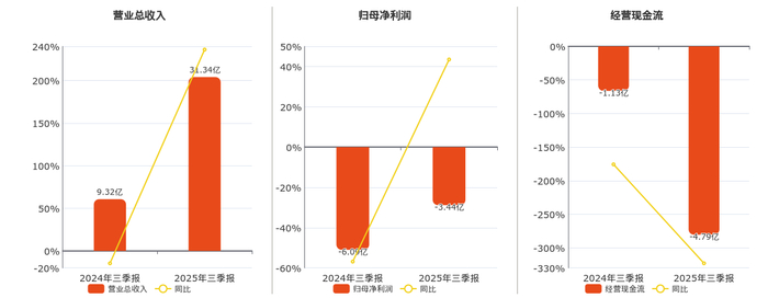 公司营业总收入为31.34亿元,在已披露的同业公司中排名第3,较去年同报告期营业总收入增加10.16亿元,实现2年连续上涨,同比较去年同期上涨47.99%。归母净利润为-3.44亿元,较去年同报告期归母净利润增加3.31亿元。经营活动现金净流入为-4.79亿元。