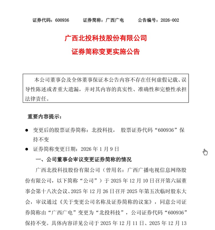 1月6日,广西北投科技股份有限公司(简称北投科技)连发两份公告,宣布公司名称已由曾用名“广西广播电视信息网络股份有限公司”变更为现名;同时,公司证券简称将于1月9日起由“广西广电”变更为“北投科技”,证券代码“600936”保持不变。此举标志着这家曾经的老牌文化传媒企业已全面告别传统广播电视网络业务,正式“脱胎换骨”转型为科技企业。