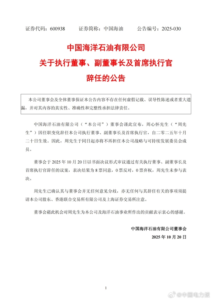 【周心怀辞任】10月20日,中国海洋石油有限公司关于执行董事、副董事长及首席执行官辞任的公告称,中国海洋石油有限公司董事会谨此宣布,周心怀先生因任职变化辞任本公司执行董事、副董事长及首席执行官,自二零二五年十月二十日生效。因此,周先生于同日起亦将不再担任本公司战略与可持续发展委员会成员。(来源:上海证券交易所、中国海油)