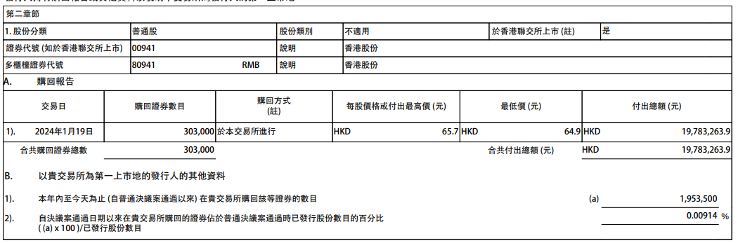 中国移动:今日耗资约1978.33万港元回购30.3万股公司股份