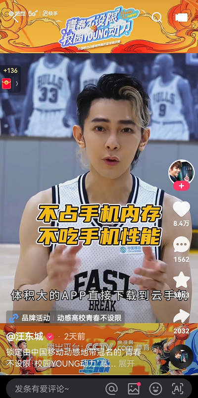 尤其是在内容方面,快手将品牌利益点与热点完美融合,有效增强用户记忆点与好感度。例如,汪东城在活动视频中,一秒切换运动和工作状态,由此植入中国移动云手机产品。“工作、娱乐、生活多重分身,随时切换。有了它,一个人就是一个队伍。”汪东城全面分享云手机的云端存储不占内存、跨系统账号操作、每个月30G流量等产品亮点。