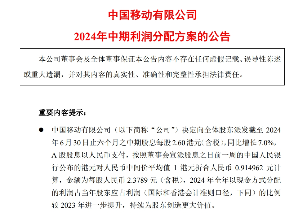 中国移动出手:分红510亿!上半年净利润802亿元,客户突破10亿户