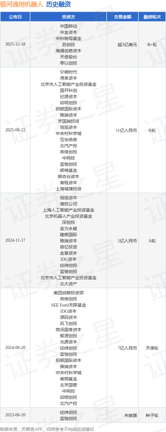 证券之星消息,根据天眼查APP于12月18日公布的信息整理,北京银河通用机器人股份有限公司B+轮融资,融资额超3亿美元,参与投资的机构包括中国移动,中金资本,中科院母基金,苏创投,海通创意资本,天奇股份,零以创投。
