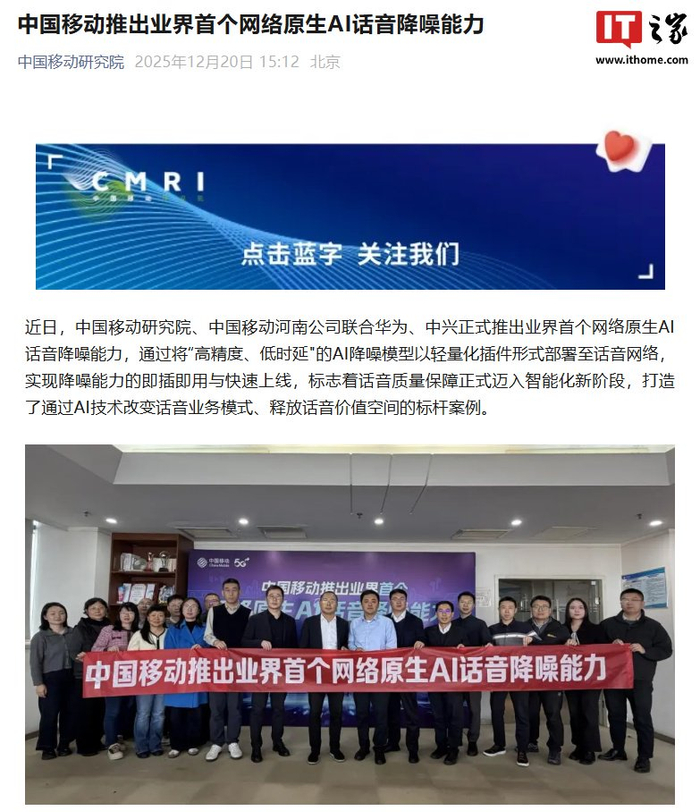 IT之家 12 月 21 日消息,中国移动研究院、中国移动河南公司近日联合华为、中兴正式推出业界首个网络原生 AI 话音降噪能力,通过将“高精度、低时延”的 AI 降噪模型以轻量化插件形式部署至话音网络,实现降噪能力的即插即用与快速上线。