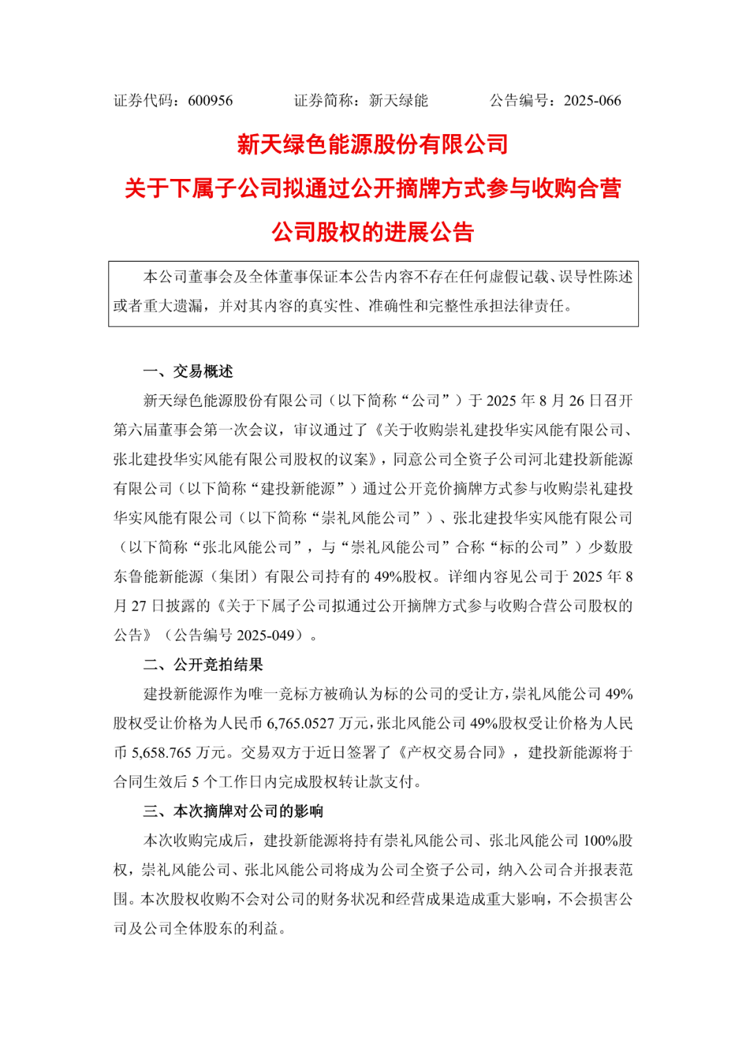 根据公告,新天绿能于2025年8月26日召开第六届董事会第一次会议,审议通过了《关于收购崇礼建投华实风能有限公司、张北建投华实风能有限公司股权的议案》,同意公司全资子公司河北建投新能源有限公司(以下简称“建投新能源”)通过公开竞价摘牌方式参与收购崇礼建投华实风能有限公司(以下简称“崇礼风能公司”)、张北建投华实风能有限公司(以下简称“张北风能公司”,与“崇礼风能公司”合称“标的公司”)少数股东鲁能新能源(集团)有限公司持有的49%股权。