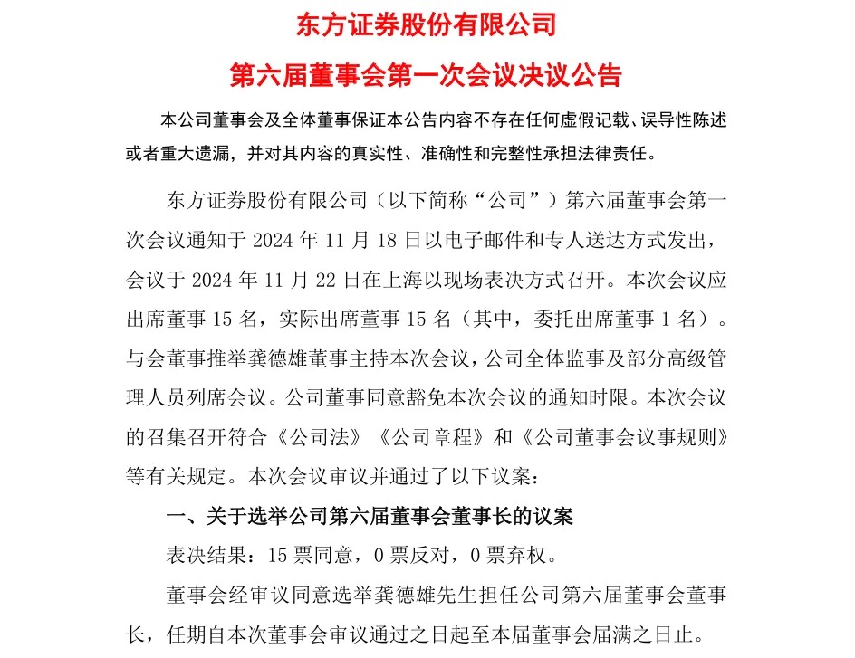 公告,公司于当日召开第六届董事会第一次会议,选举龚德雄为第六届董事会董事长。龚德雄继2023年9月担任东方证券党委书记后,将正式接任履职东方证券董事长。