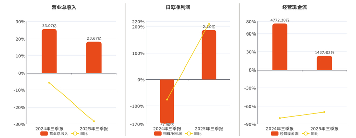 公司营业总收入为23.67亿元,在已披露的同业公司中排名第89。归母净利润为2.10亿元,在已披露的同业公司中排名第65,较去年同报告期归母净利润增加4.00亿元。经营活动现金净流入为1437.02万元。