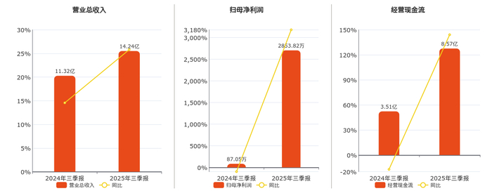 公司营业总收入为14.24亿元,较去年同报告期营业总收入增加2.92亿元,实现2年连续上涨,同比较去年同期上涨25.79%。归母净利润为2853.82万元,较去年同报告期归母净利润增加2766.76万元,同比较去年同期上涨3178.21%。经营活动现金净流入为8.57亿元,在已披露的同业公司中排名第7,较去年同报告期经营活动现金净流入增加5.06亿元,同比较去年同期上涨144.00%。