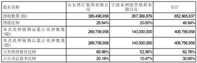 ● 截至本公告日,控股股东山东博汇集团有限公司(以下简称“博汇集团”)及其一致行动人金光纸业(中国)投资有限公司、宁波亚洲纸管纸箱有限公司持有公司股份数量为652,871,937股,占公司总股本的48.84%。本次质押展期后,博汇集团及其一致行动人累计质押数量为409,756,958股,占其持有公司股份数的62.76%,占公司总股本的30.65%,剩余未质押股份数量为243,114,979股,均为无限售流通股。