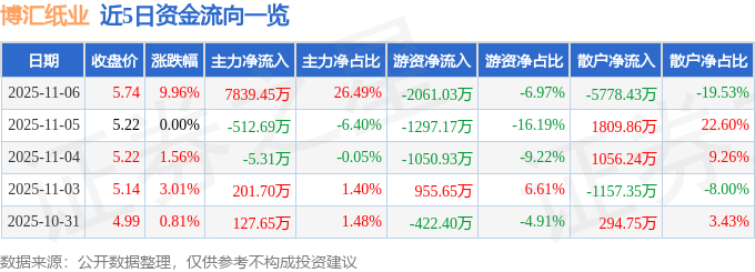 证券之星消息,博汇纸业11月6日涨停收盘,收盘价5.74元。该股于13点29分涨停,未打开涨停,截止收盘封单资金为3162.99万元,占其流通市值0.41%。
