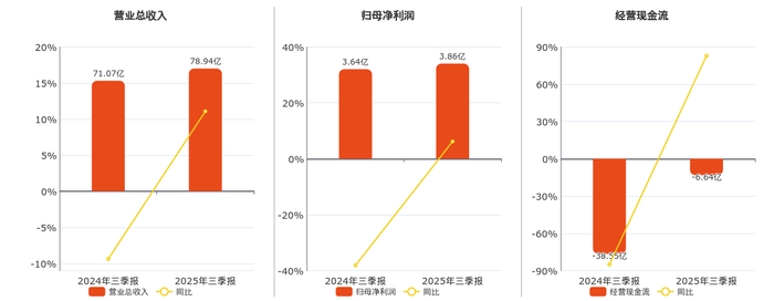公司营业总收入为78.94亿元,在已披露的同业公司中排名第1,较去年同报告期营业总收入增加7.87亿元,同比较去年同期上涨11.07%。归母净利润为3.86亿元,在已披露的同业公司中排名第1,较去年同报告期归母净利润增加2249.33万元,同比较去年同期上涨6.18%。经营活动现金净流入为-6.64亿元,较去年同报告期经营活动现金净流入增加31.91亿元。