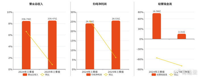 公司营业总收入为339.47亿元,较去年同报告期营业总收入增加2.72亿元,实现5年连续上涨,同比较去年同期上涨0.81%。归母净利润为28.53亿元,较去年同报告期归母净利润增加1.64亿元,实现5年连续上涨,同比较去年同期上涨6.11%。经营活动现金净流入为3.31亿元。