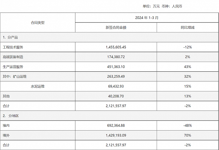 中材国际:第一季度新签合同金额212.16亿元,同比下滑2%