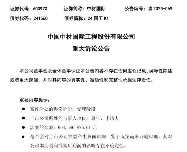 中国中材国际工程股份有限公司(简称:中材国际)近日公告,因与广西锦象水泥有限公司(下称“广西锦象”)存在建设工程合同纠纷,中材国际已向广西壮族自治区来宾市中级人民法院提起民事诉讼,涉案金额达90458.09万元(约9.05亿元)。目前,法院已正式受理该案,案件处于受理阶段。