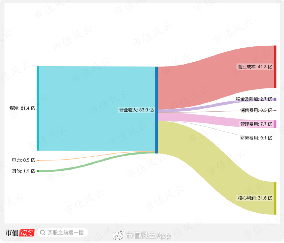 风云君用2022年年报数据作为一个桑基图,给各位库里南车主来个核心利润解析:公司绝大部分营收来自煤炭,占到81.4亿,核心利润率37.69%。