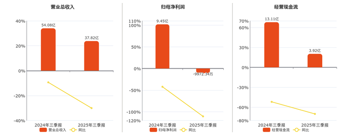 公司营业总收入为37.82亿元,较去年同报告期营业总收入减少16.26亿元,同比较去年同期下降30.07%。归母净利润为-9972.34万元,较去年同报告期归母净利润减少10.44亿元,同比较去年同期下降110.56%。经营活动现金净流入为3.92亿元,较去年同报告期经营活动现金净流入减少9.20亿元,同比较去年同期下降70.13%。