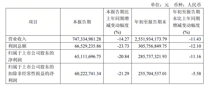 2025年前三季度,健民集团实现营业收入25.52亿元,同比下降11.43%;归母净利润2.86亿元,同比下降11.16%。其中第三季度营业收入7.47亿元,同比下降14.27%;归母净利润0.65亿元,同比下降20.84%。