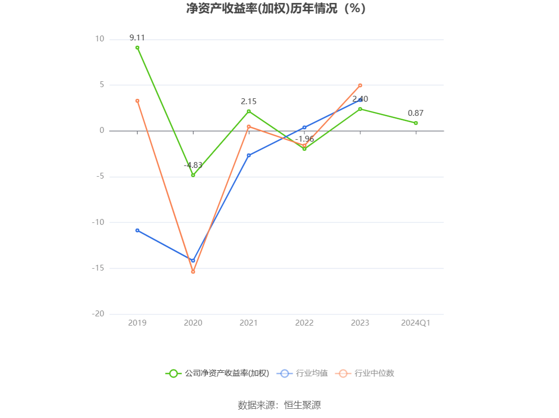 数据显示,2024年第一季度公司加权平均净资产收益率为0.87%,较上年同期下降0.80个百分点;公司2024年第一季度投入资本回报率为0.54%,较上年同期下降0.86个百分点。