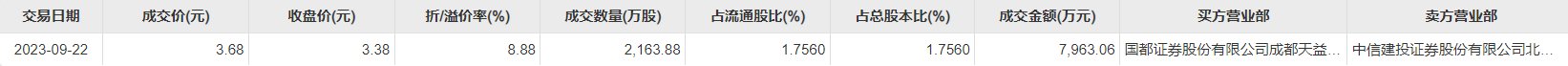 9月22日大宗交易成交2163.88万股,成交额7963.06万元,占当日总成交额的70.92%,成交价3.68元,较市场收盘价3.38元溢价8.88%。