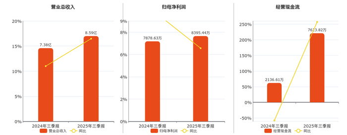 公司营业总收入为8.59亿元,较去年同报告期营业总收入增加1.22亿元,实现5年连续上涨,同比较去年同期上涨16.48%。归母净利润为8395.44万元,较去年同报告期归母净利润增加516.82万元,实现5年连续上涨,同比较去年同期上涨6.56%。经营活动现金净流入为7623.82万元,较去年同报告期经营活动现金净流入增加5487.21万元,同比较去年同期上涨256.82%。