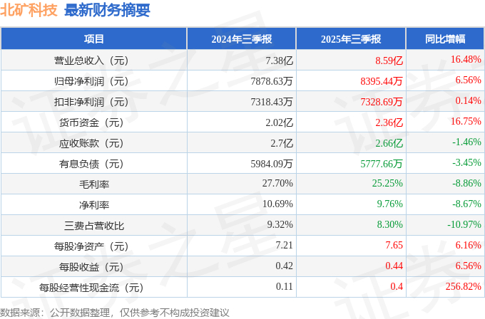 据证券之星公开数据整理,近期北矿科技(600980)发布2025年三季报。截至本报告期末,公司营业总收入8.59亿元,同比上升16.48%,归母净利润8395.44万元,同比上升6.56%。按单季度数据看,第三季度营业总收入3.07亿元,同比上升18.28%,第三季度归母净利润2964.26万元,同比下降0.12%。本报告期北矿科技公司应收账款体量较大,当期应收账款占最新年报归母净利润比达251.29%。
