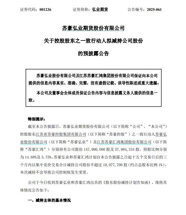 弘业期货:苏豪弘业和苏豪汇鸿计划减持公司股份不超过约1008万股