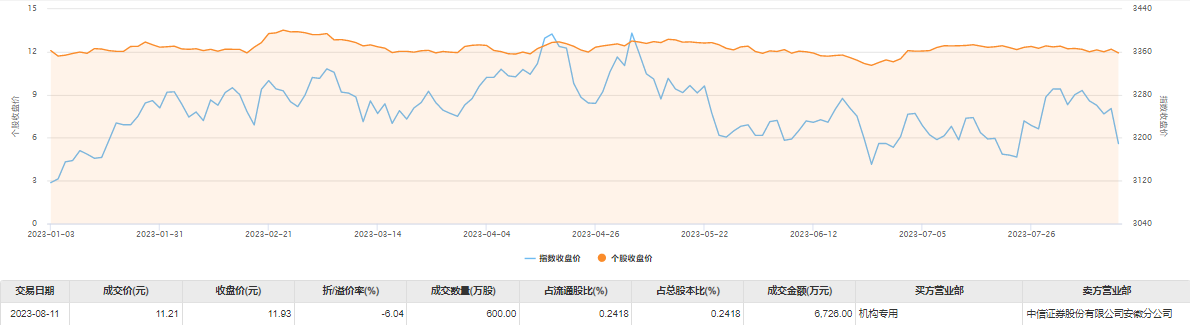 今日大宗交易成交600万股,成交额6726万元,占当日总成交额的36.13%,成交价11.21元,较市场收盘价折价6.04%。