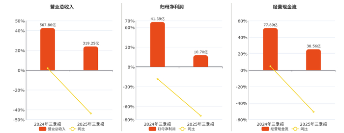 公司营业总收入为319.25亿元,在已披露的同业公司中排名第5,较去年同报告期营业总收入减少248.61亿元,同比较去年同期下降43.78%。归母净利润为10.70亿元,在已披露的同业公司中排名第11,较去年同报告期归母净利润减少30.69亿元,同比较去年同期下降74.14%。经营活动现金净流入为38.56亿元,在已披露的同业公司中排名第8,较去年同报告期经营活动现金净流入减少39.33亿元,同比较去年同期下降50.49%。