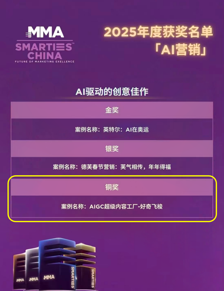 近日,MMA SMARTIES CHINA 2025奖项正式揭晓。浙文互联自主研发的AIGC超级内容工厂「好奇飞梭」凭借卓越的创意能力与成熟的商业实践,成功斩获【AI营销】AI驱动的创意佳作铜奖。