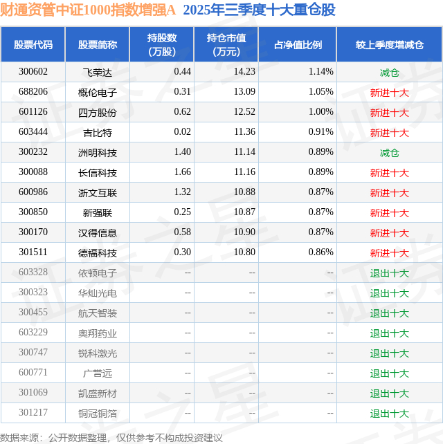 财通资管中证1000指数增强A的前十大重仓股如下: