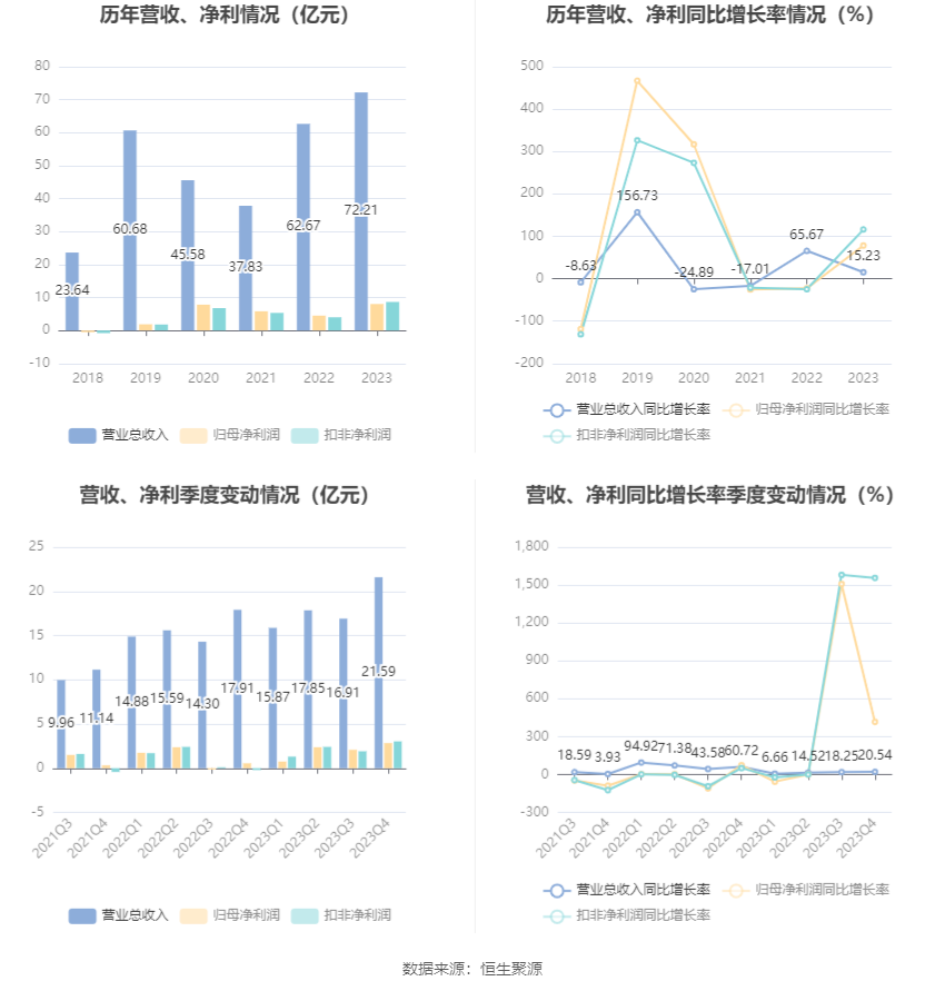 2023年,公司毛利率为32.58%,同比上升3.94个百分点;净利率为12.06%,较上年同期上升4.18个百分点。从单季度指标来看,2023年第四季度公司毛利率为36.81%,同比上升17.58个百分点,环比上升8.21个百分点;净利率为14.63%,较上年同期上升13.78个百分点,较上一季度上升2.71个百分点。
