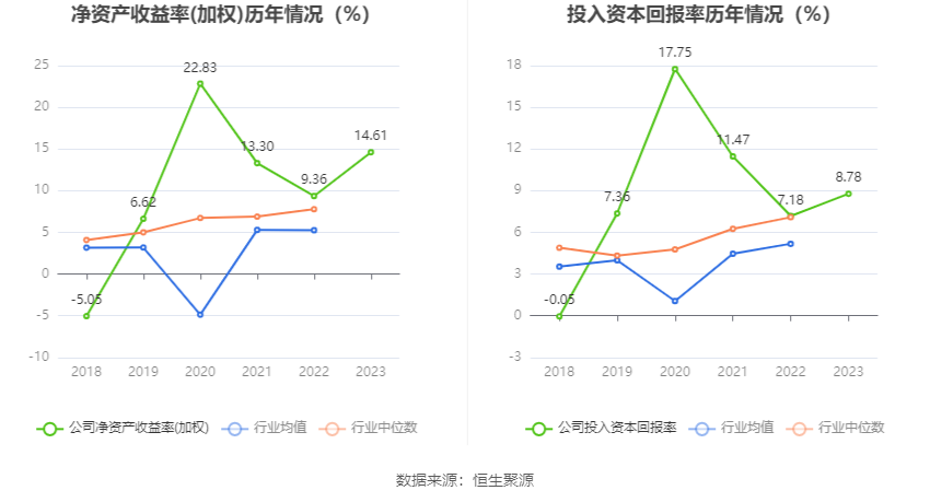 数据显示,2023年公司加权平均净资产收益率为14.61%,较上年同期增长5.25个百分点;公司2023年投入资本回报率为8.78%,较上年同期增长1.60个百分点。