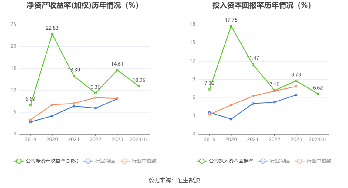 数据显示,2024年上半年公司加权平均净资产收益率为10.96%,较上年同期增长5.12个百分点;公司2024年上半年投入资本回报率为6.62%,较上年同期增长2.98个百分点。