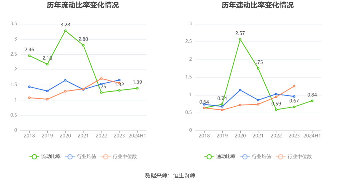 2024年上半年,公司流动比率为1.39,速动比率为0.84。