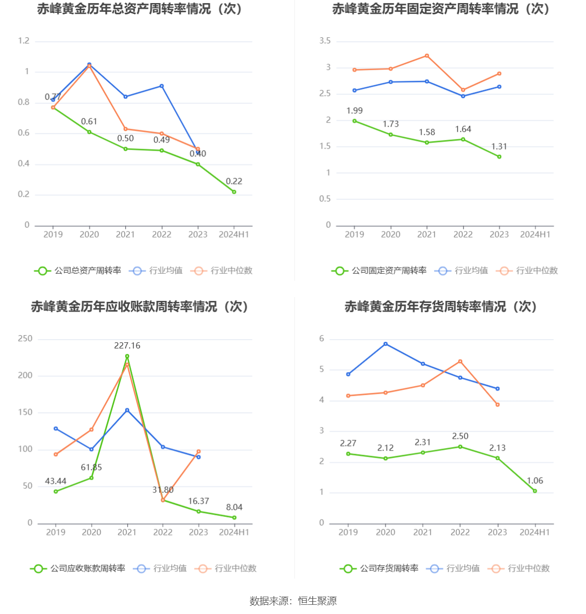 营运能力方面,2024年上半年,公司总资产周转率为0.22次,上年同期为0.19次(2023年上半年行业平均值为0.25次,公司位居同行业8/11);公司应收账款周转率、存货周转率分别为8.04次、1.06次。