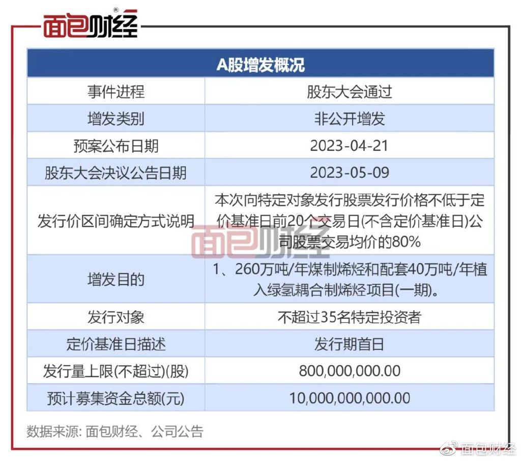 2023年4月21日,宝丰能源发布上市以来首次定增预案,拟发行不超8亿股(含本数),募资总额不超100亿元。此次定增预案已于5月9日获股东大会通过。