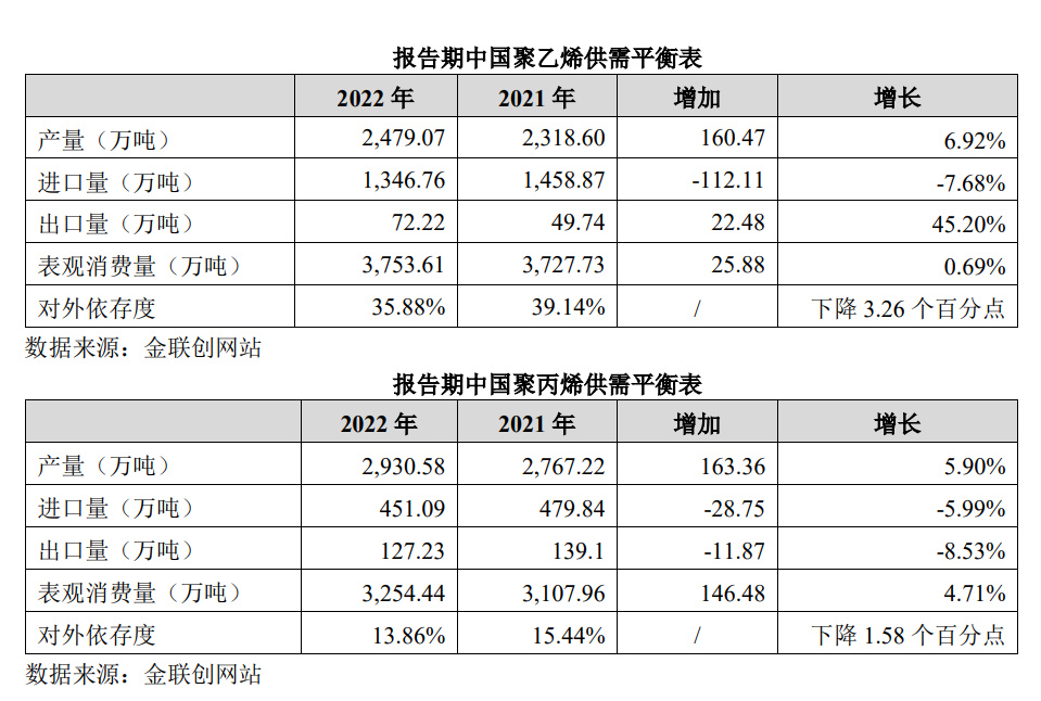 公司表示,2022年我国聚乙烯、聚丙烯供给端增长和增速均高于需求端。