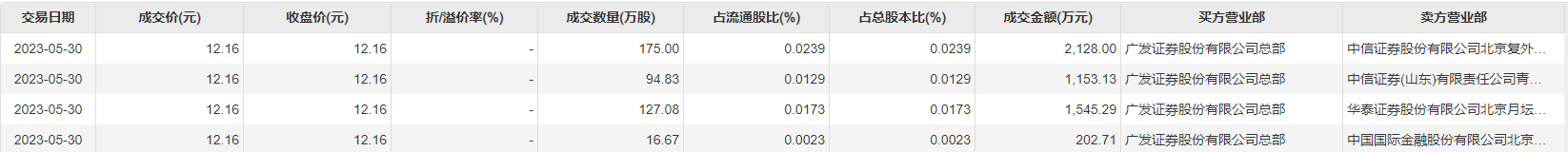 5月30日大宗交易成交413.58万股,成交额5029.13万元,占当日总成交额的13.38%,成交价12.16元,较市场收盘价12.16元持平。