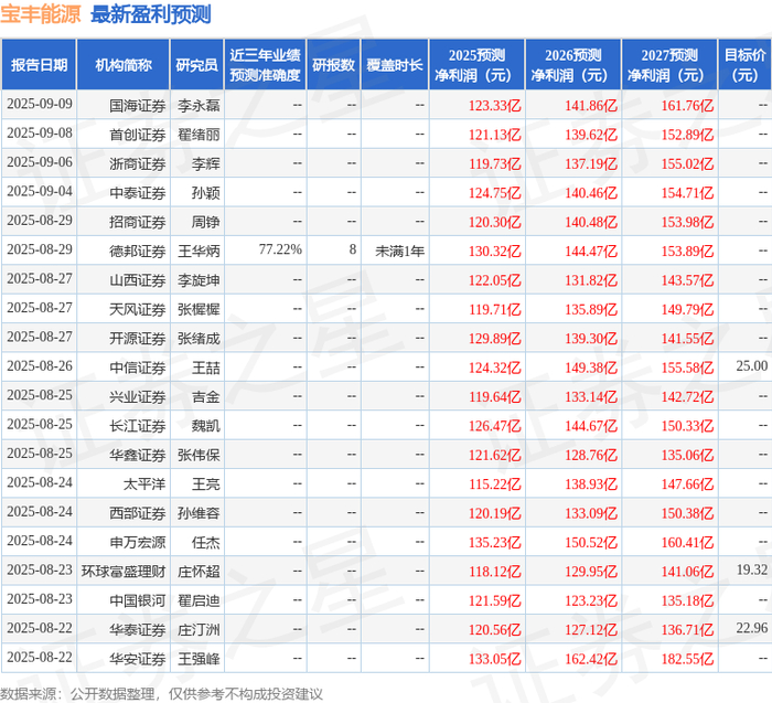 证券之星数据中心根据近三年发布的研报数据计算,德邦证券王华炳研究员团队对该股研究较为深入,近三年预测准确度均值为77.22%,其预测2025年度归属净利润为盈利130.32亿,根据现价换算的预测PE为9.35。