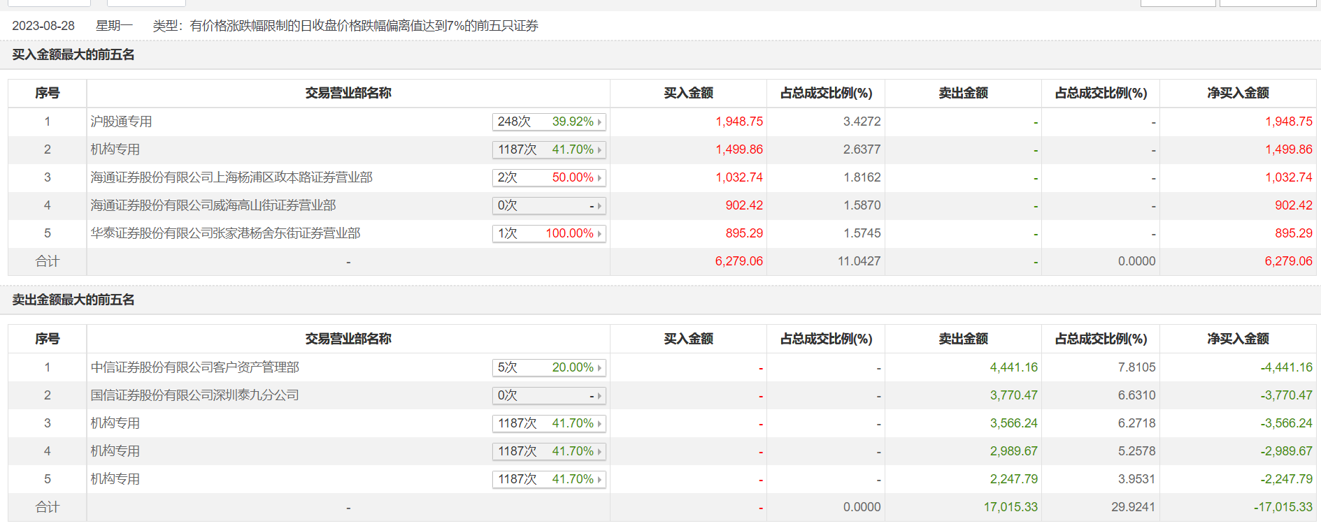 具体来看,机构买入1499.86万元,卖出8803.71万元,合计净卖出7303.85万元。此外,中信证券客户资产管理部、国信证券深圳泰九分公司分别卖出4441.16万元、3770.47万元;沪股通专用、海通证券上海杨浦区政本路证券营业部分别买入1948.75万元、1032.74万元。